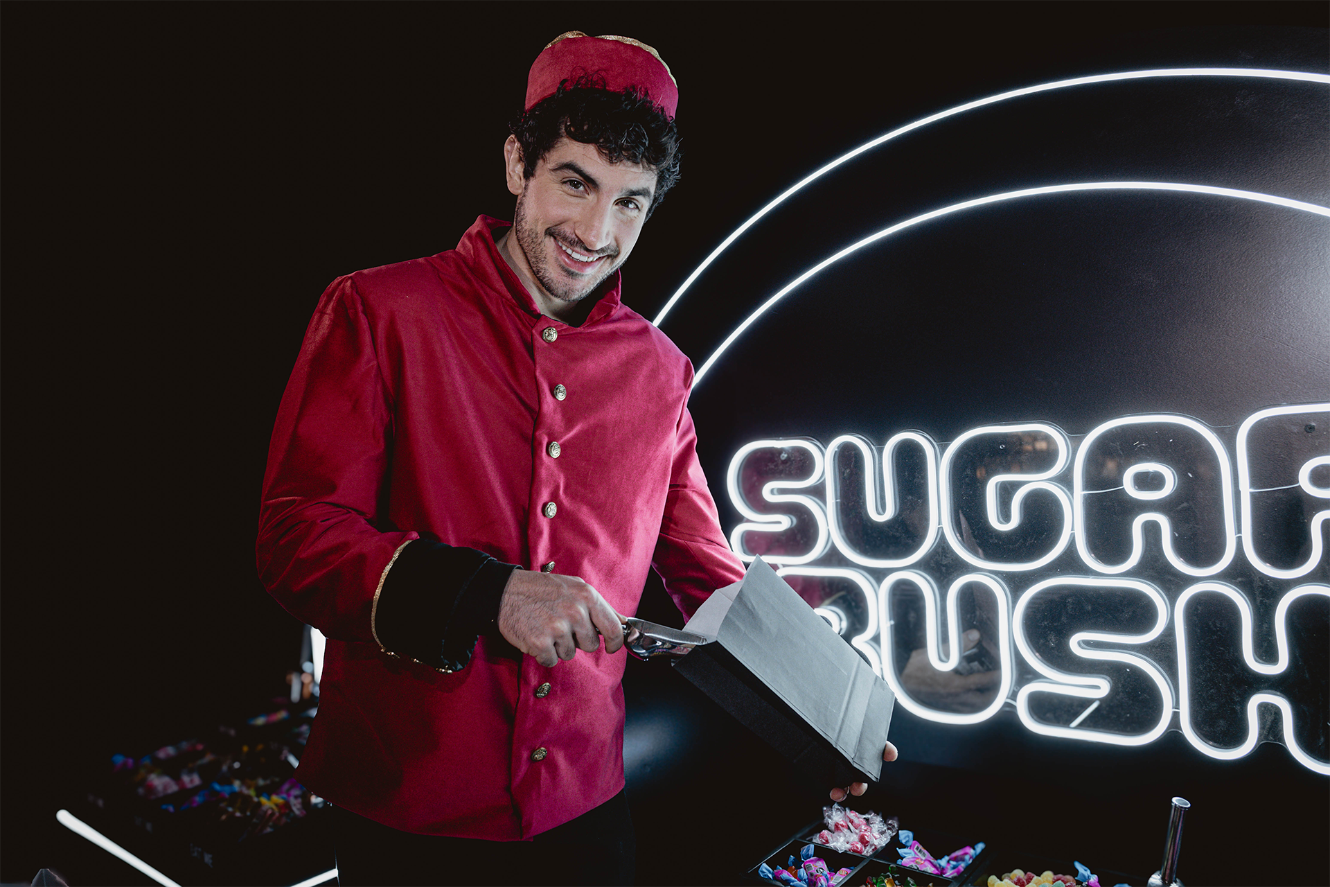 Dos performers irrumpen al final del evento repartiendo deliciosas galletas estilo Crumble, en un carrito o bandeja tematizada.