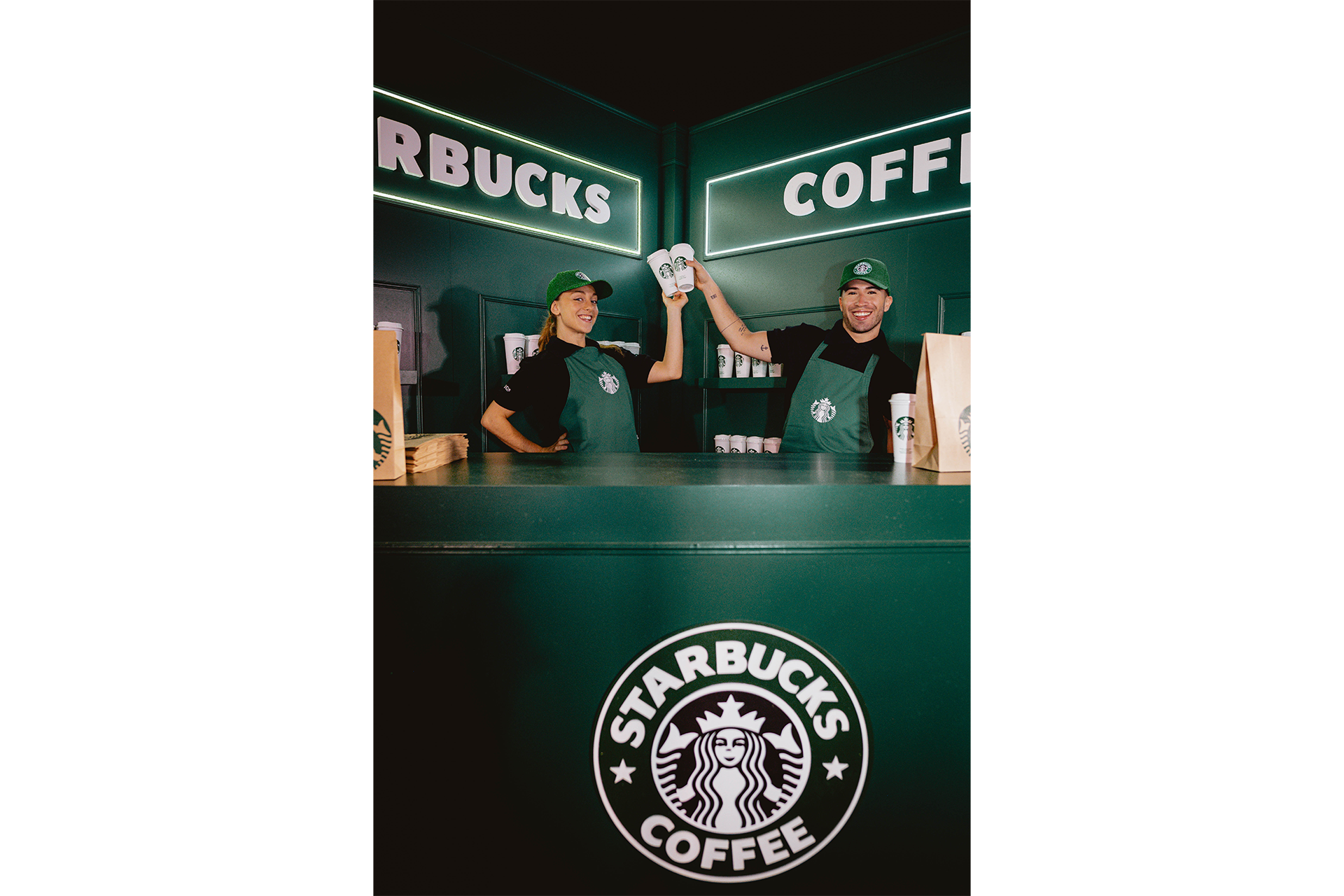 Dos performers se encargan de entregar vasos de café estilo Starbucks personalizados al final del evento.